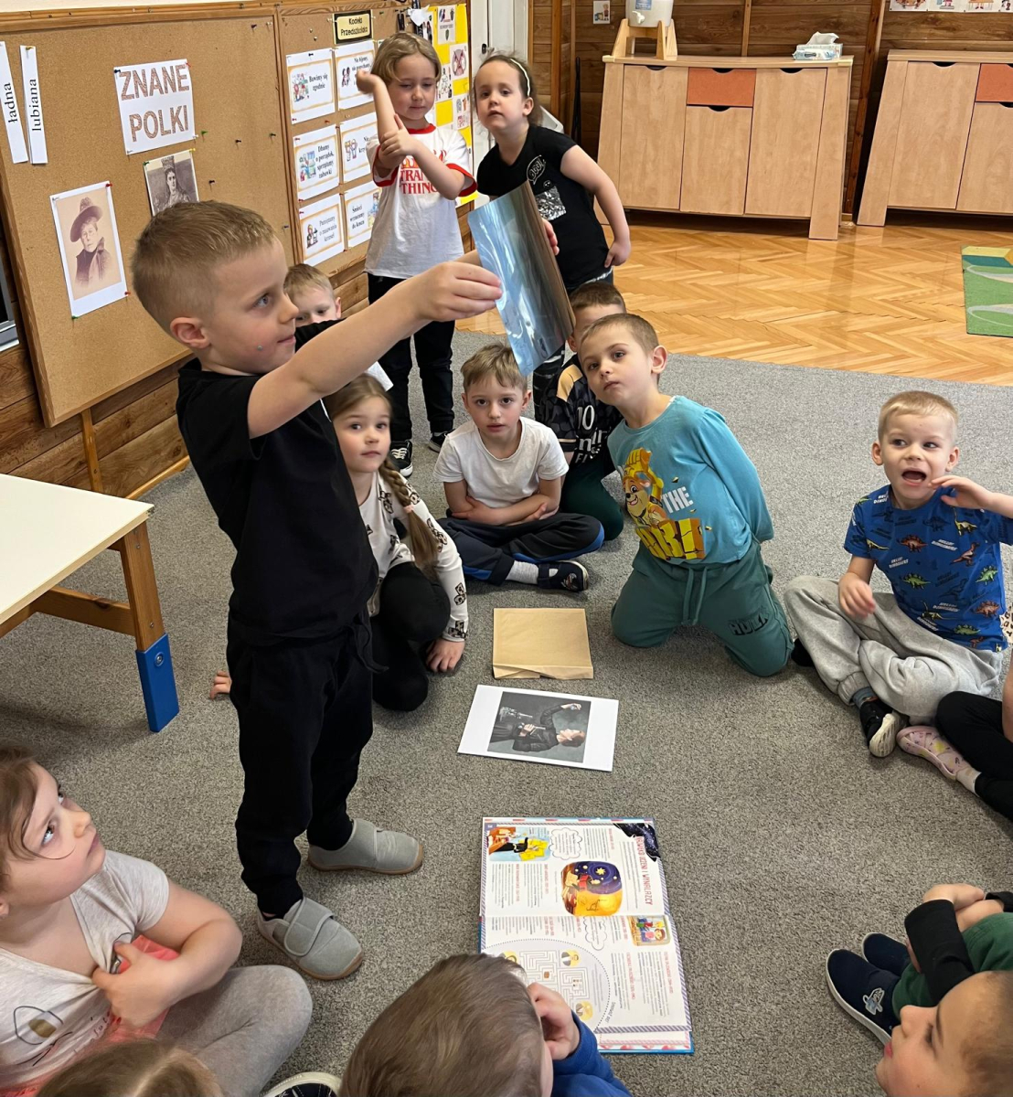Dzieci z ciekawością wysłuchały faktów z ich życia. Obejrzały krótką prezentację o "Stopce Królowej", dzięki której poznały legendę dotyczącą Królowej. Dowiedziały się o odkryciu nowych pierwiastków promieniotwórczych polonu i radu. Wysłuchały wiersza wspaniałej autorki pt. ”Stefek Burczymucha”. Dzielnie podejmowały się rozwiązywania różnorodnych zadań poprzez zabawę, opowieści i aktywności angażujące wiele zmysłów. Na zakończenie zajęć dzieci wykonały portret królowej techniką rysowania ołówkiem. Głównym celem zajęć było budowanie szacunku do kobiet i szanowanie ich dokonań.