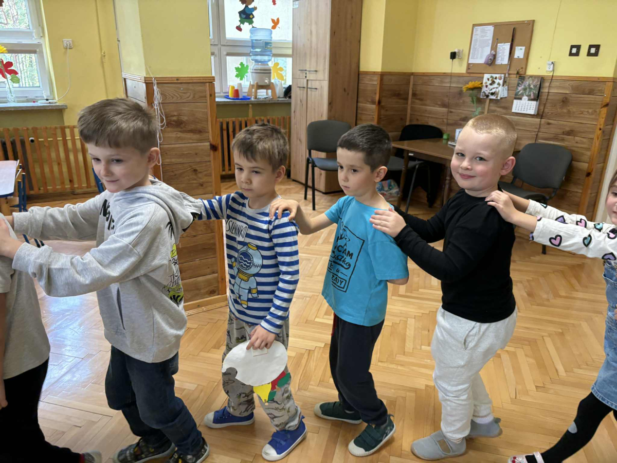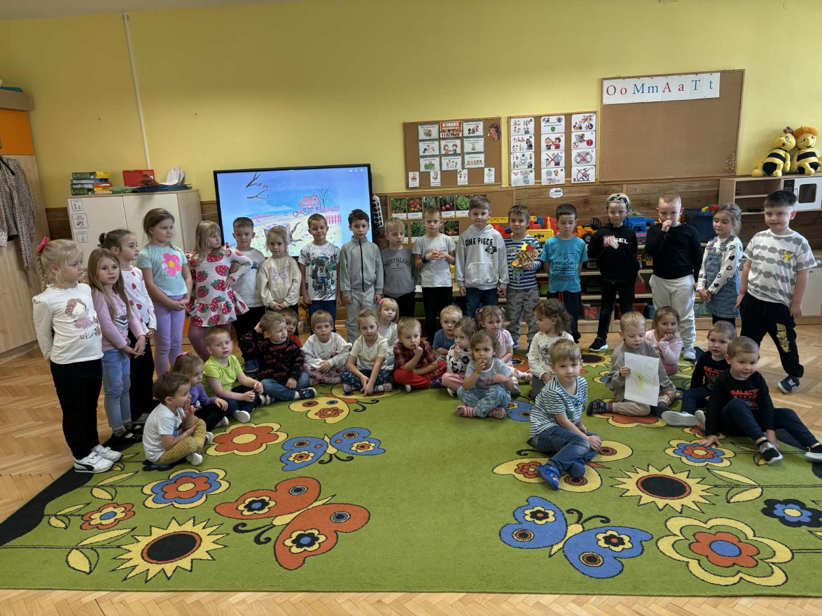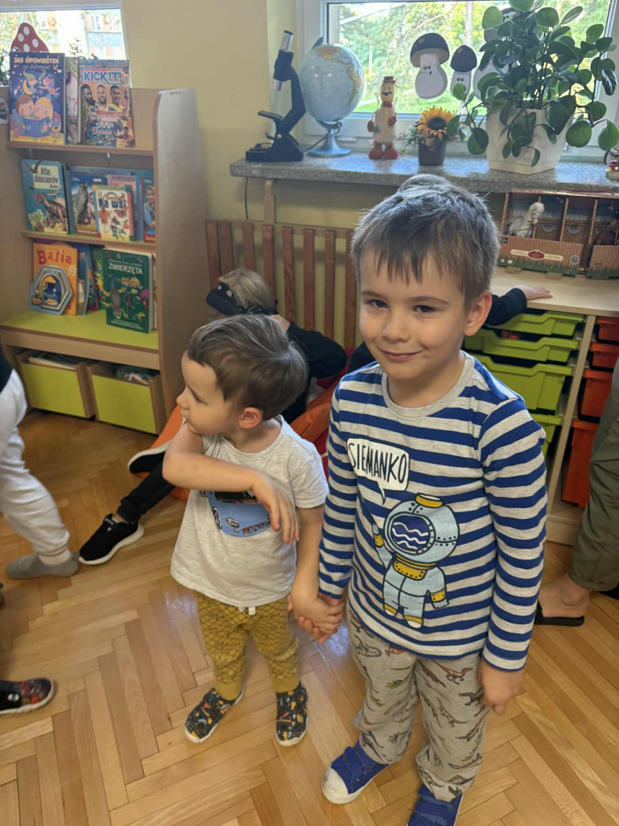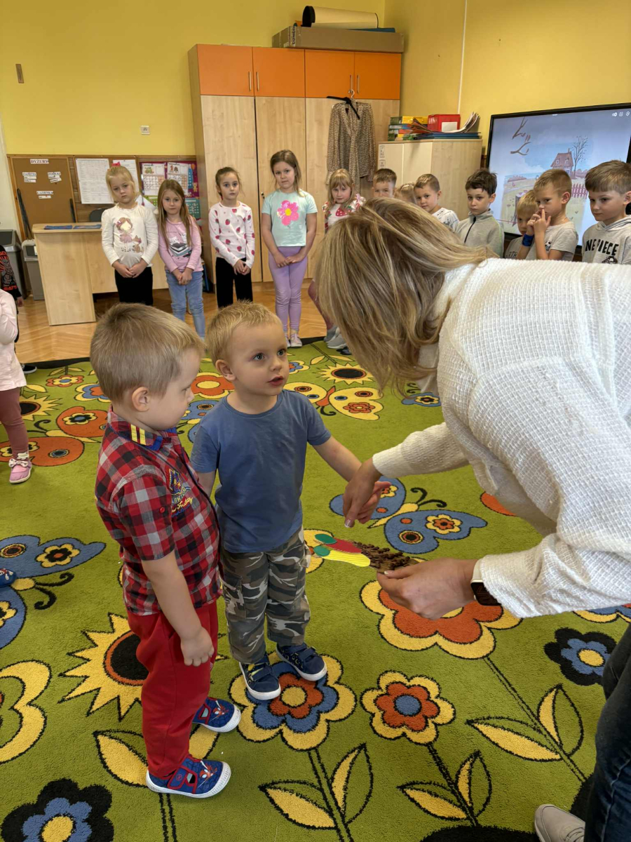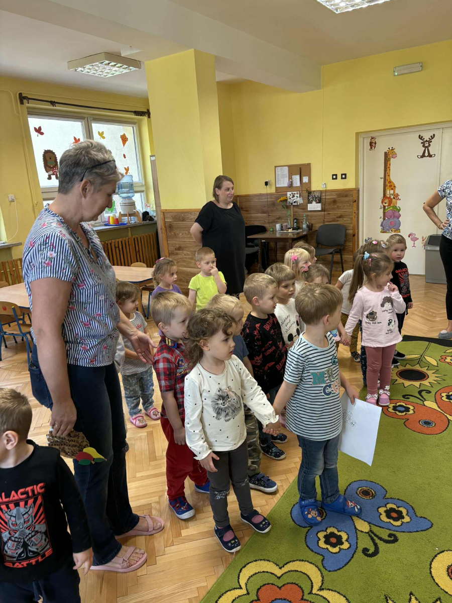 15 października grupa II „Serduszek” dzieci 3- i 4-letnich odwiedziła „starszaków” – dzieci 6-letnie z grupy „Jeżyków”. Jak obyczaj dobry nakazuje „Serduszka” przyniosły dla dzieci prezent – pięknego wyklejonego z darów jesieni jeżyka – symbol grupy. Przedszkolaki z grupy „Jeżyków” przyjęły maluszków miło i serdecznie. Ciepło się nimi zaopiekowały: pokazały im swoją salę, zabawki i pobawiły się w nieznane dotąd „Serduszkom” zabawy muzyczno-ruchowe. Serdecznie dziękujemy za to spotkanie!