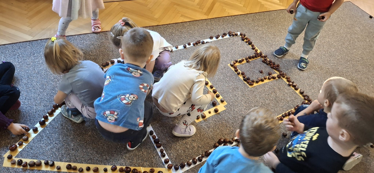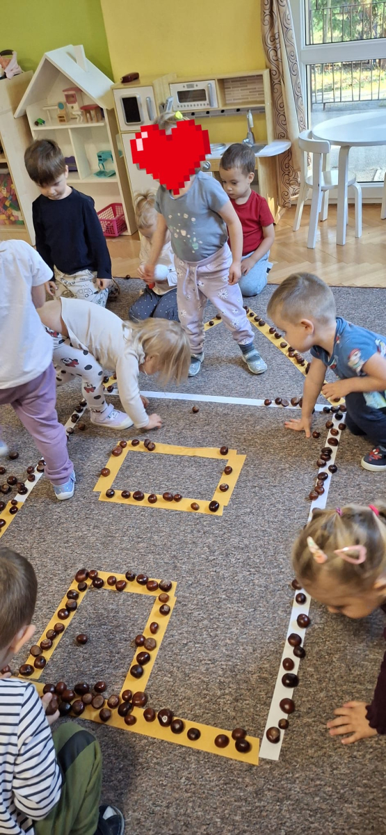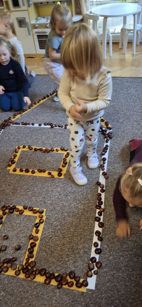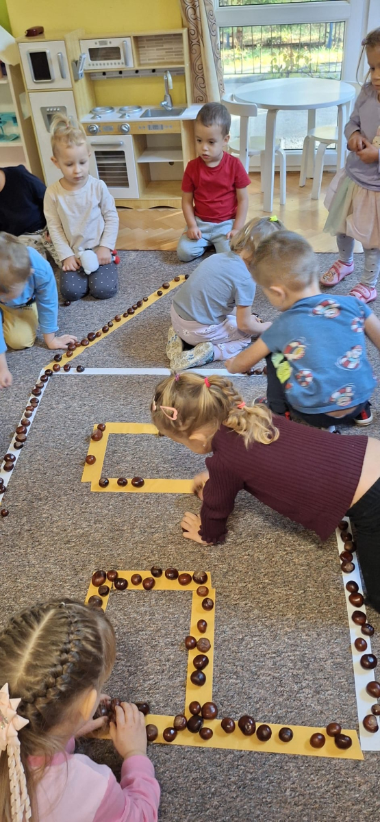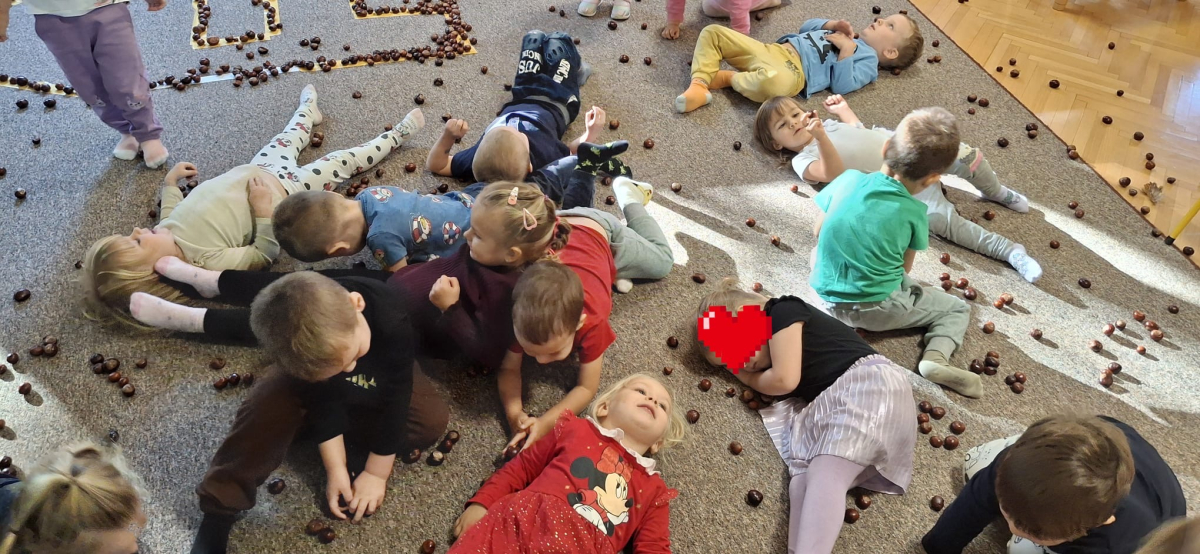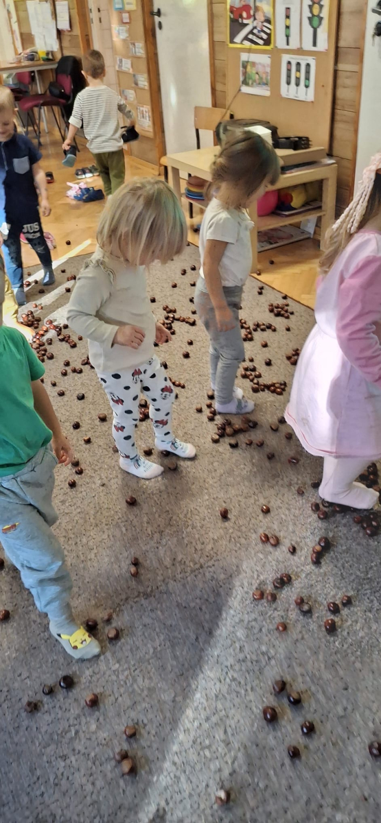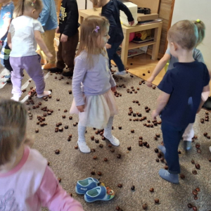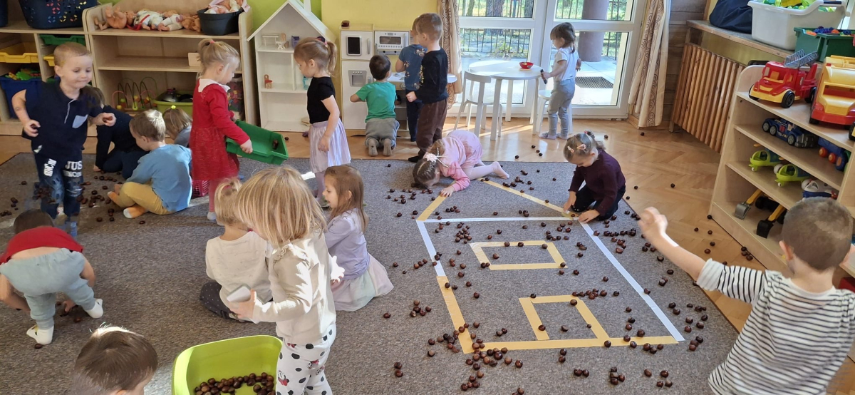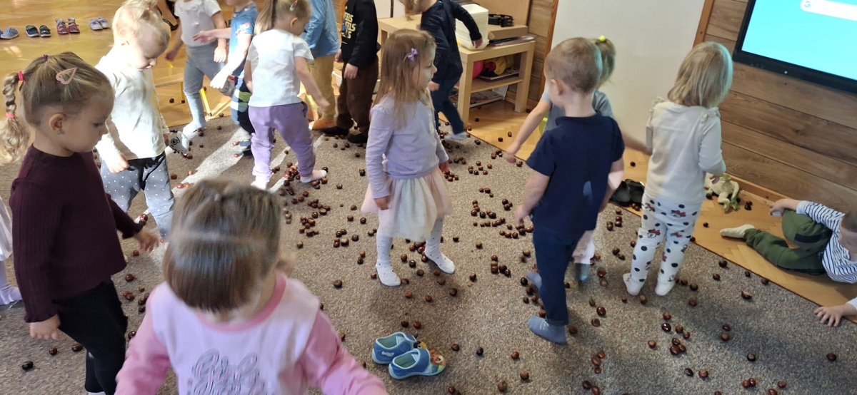 Jesień to jedna z najpiękniejszych pór roku, pełna kolorowych barw, obfita w naturalne dary: kasztany, żołędzie, orzechy. Przedszkolaki z grupy „Poziomek” przyniosły do przedszkola olbrzymią ilość kasztanów, które posłużyły do różnorodnych zabaw i aktywności. Dzieci układały wzory, przeliczały, segregowały. Jednak największą frajdę sprawiła dzieciom zabawa sensoryczna, podczas której „Poziomeczki” chodziły po kasztanach na boso, turlały się i leżały na kasztanach.