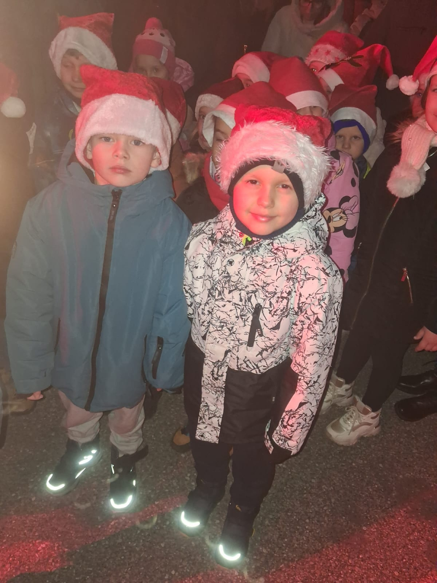 Zachwycającym wykonaniem pastorałki „Od serca do ucha” wzruszyły publiczność dzieci z grup „Misie” i „Jeże” z Miejskiego Przedszkola w Bukownie podczas Jarmarku Bożonarodzeniowego w Bukownie, który odbył się 13 grudnia 2025 roku na placu przed Urzędem Miejskim.