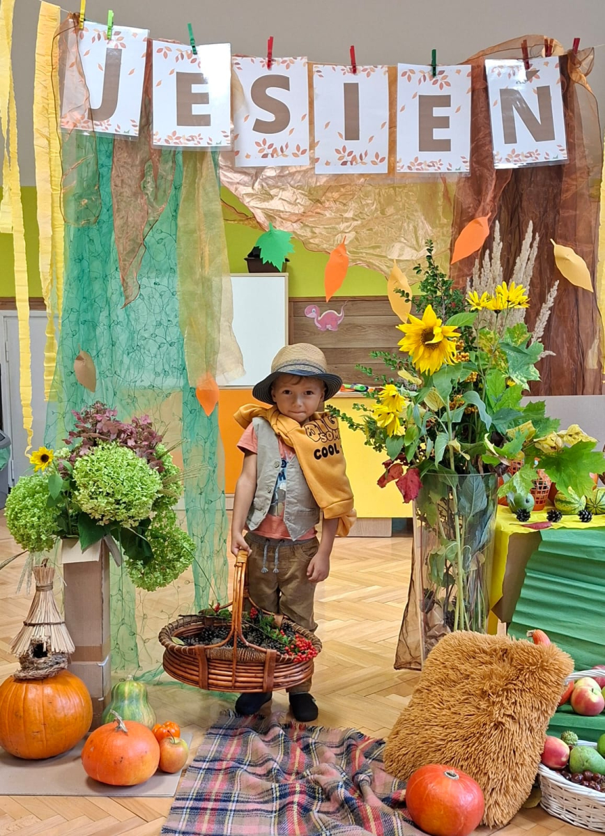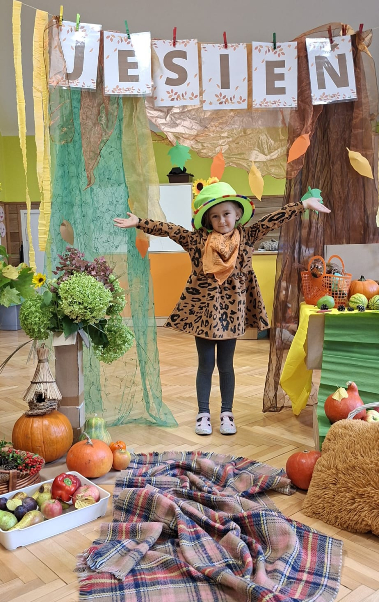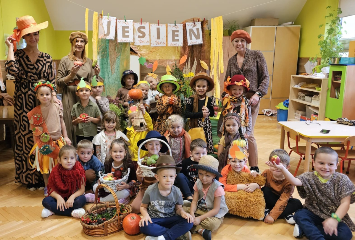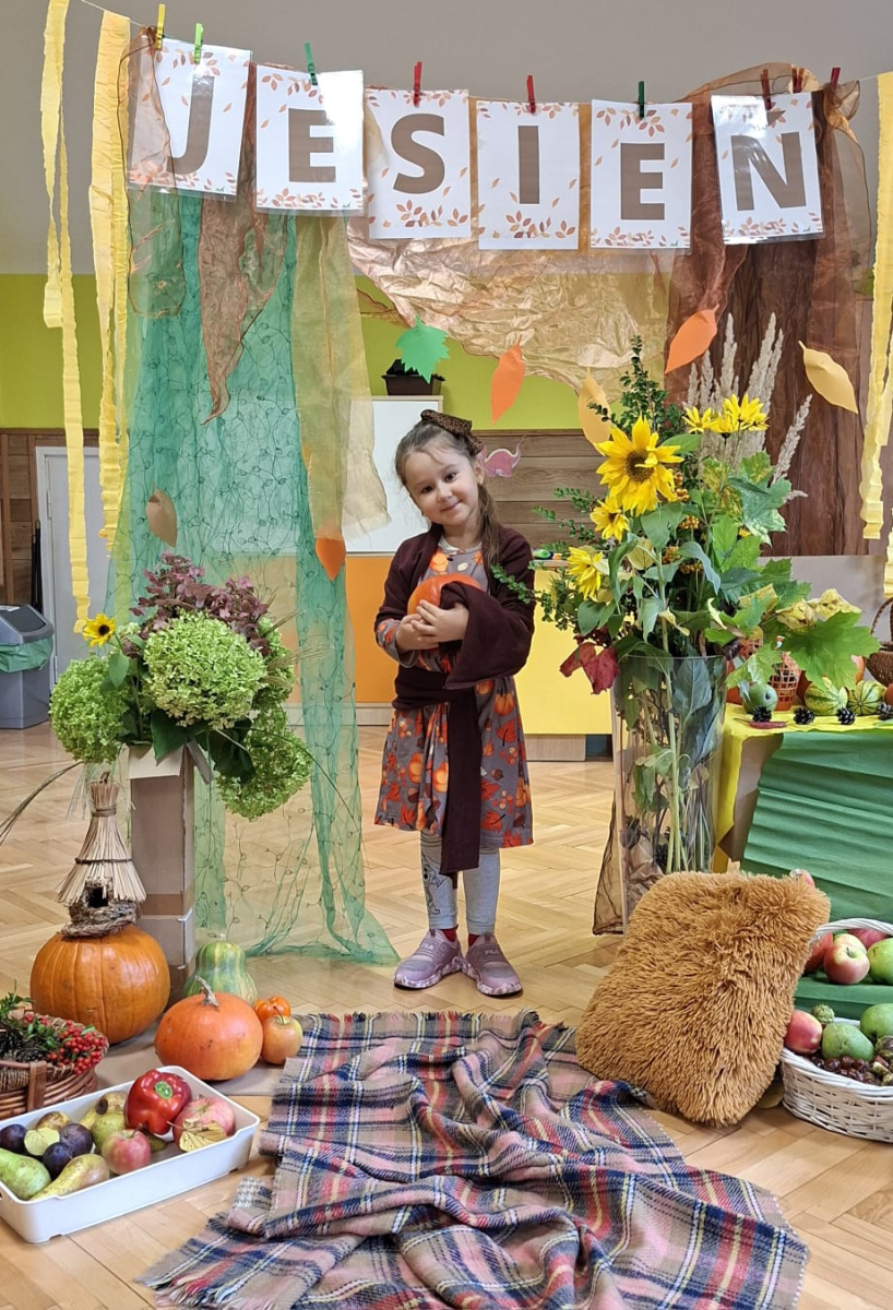 23 września dzieci z grupy „Dinusie” uroczyście przywitały Panią Jesień, która będzie panować przez najbliższe miesiące. W związku z nową porą roku zmienił się wystrój w naszej sali. W kącikach pojawiły się dary jesieni: kolorowe liście, kasztany, żołędzie, owoce i warzywa z sadu. Wiele radości sprawiła dzieciom zabawa w przebieranie się w stroje jesienne a następnie odbył się ”Pokaz mody jesiennej”. Dinusie w tym dniu wykazały się wiedzą na temat nowej pory roku i jej oznak m.in.: zmiana pogody, opadające liście, zbiór owoców i warzyw. Dzieci wspominają ten dzień bardzo miło.