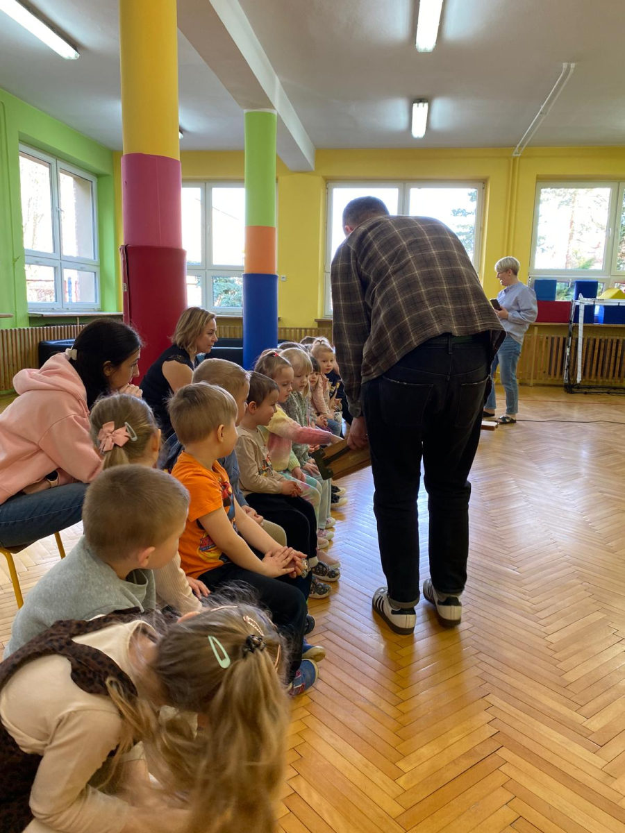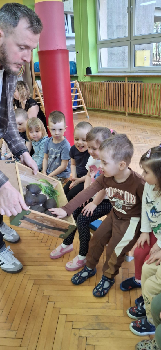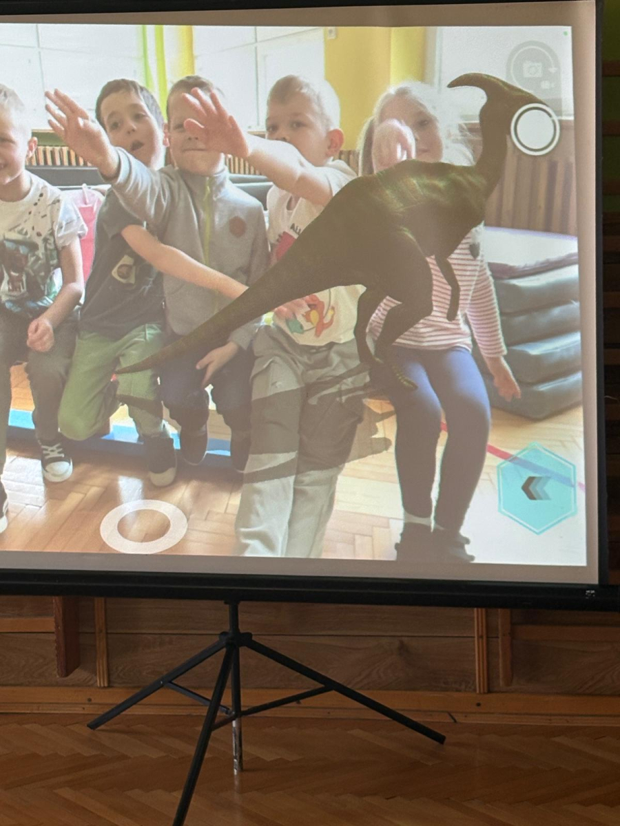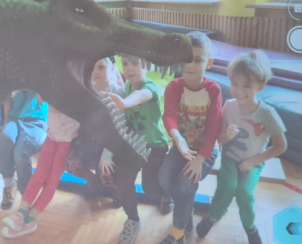 10 marca w przedszkolu odbyły się zajęcia multimedialne dla dzieci „W świecie dinozaurów”. Zajęcia odbyły się z zachowaniem podziału na grupy wiekowe. Wspólnie z przewodnikiem otwierane były magiczne, drewniane skrzynie ze szczątkami dinozaurów. Poprzez wrażenia zmysłowe (dotyk, węch, wygląd) oraz opowiadanie prowadzącego, dzieci mogły wyobrazić sobie i poczuć obecność tych zwierząt. Największą atrakcją były doznania podczas projekcji multimedialnej, gdzie do rzeczywistego, odtwarzanego przez rzutnik zdjęcia przedszkolaków, „wpuszczane” zostały kolejno dinozaury. Zwierzęta można było pogłaskać, zawołać…, a nawet przepędzić!